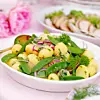 Tvätta potatisen och koka den mjuk. Häll av vattnet och ånga den torr. Skala, dela och skiva löken tunt. Skiva salladslöken. Ansa sockerärterna och koka dem 1 minut i saltat vatten. Spola dem i kallt vatten.