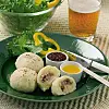 Dela rullen i 12-14 bitar. Forma dem till runda bullar och gör en grop för fyllningen.