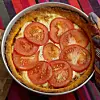 Rör ihop crème fraiche och ost och klicka ut över pajen. Bred försiktigt ut blandningen över hela pajen. Lägg på skivad tomat över hela pajen. Grädda i mitt i ugnen i ca 30 minuter, tills pajen fått fin färg.