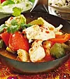 I pannan med lök och kryddor varvas tomater, paprika, chili, kycklingbitar med sin marinad och salt. Häll på vatten, lägg på tätt lock och koka upp. Låt rätten sjuda på knappt medelvarm platta cirka 15 minuter tills köttet är genomkokt.
