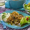 Strö över mjöl och tillsätt vatten, fond, vin och tomater. Rör om och sjud under lock i ca 25 minuter. Kontrollera att kycklingen är klar. Smaka av med ketchup, salt och peppar. Servera med kokt ris och sallad.