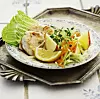 Vitkålssallad: Skala och riv morötterna. Skär äpplet i tunna klyftor. Blanda vitkål, morötter, äpple och russin. Vispa ihop olja, senap, apelsinsaft, salt och peppar, och blanda ner i salladen. Låt gärna salladen dra ett par timmar i kylen. Servera med bröd.