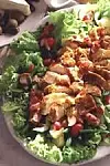 Bena ur kycklingen och skär köttet i bitar. Fördela ingredienserna på ett fatt. Bottna med sallad, grönt och frukt. Lägg kycklingbitarna på det och toppa med bacon.
