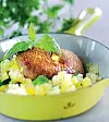 Stek dem på båda sidor i medelvarm panna. Garnera med myntablad.