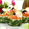 Garnering: Blanda majonnäs och crème fraiche och bred runt om och ovanpå bakelserna. Garnera kanterna med hackad dill och persilja. Lägg laxskivor ovanpå och garnera med dill, citronskivor, rom och räkor.