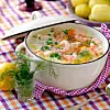 Skär laxen i tärningar. Tillsätt lax och ärter och låt sjuda, ca 5 minuter, tills laxen är klar. Rör i dill och skalade räkor. Servera med potatis och sallad.