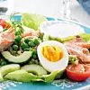 Blanda i dillen. Lägg upp sallatsblad, bulgur, delade ägg, ärter, skivad gurka och halverade tomater.