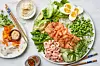 Lägg upp alla grönsaker, ris, ägg, räkor, lax och bönor på ett fat. Ringla några matskedar sojadressing över laxen. Toppa med ärtskott och sesamfrön.