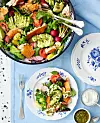 Lägg upp sallad på ett stort fat och strö över linser. Lägg på tomater, avokado, rädisor och fisk.