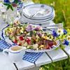 Du behöver Garnering: hackad rödlök, kryddgrönt, klippt gräslök, gräslöksblommor och ägghack Gör så här 1 Skiva eller kvarta potatisen och fördela på ett generöst uppläggningsfat....