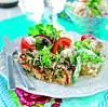 Skrubba potatisen och koka den. Ånga den torr. Ansa sugar snapsen och koka i 3 minuter. Dela tomaterna i halvor.