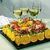 Kantskär och snygga till tårtan innan du börjar garnera den. Bred majonnäs över och runtom hela tårtan. Skär apelsinerna i tunna skivor och sätt fast dem runtom tårtan. Lägg skalade halva kiwiskivor som en ram runtom tårtan. Sätt "skinkrosor" runtom, innanför apelsinen. Stick ner halva cocktailtomater lite varstans i skinkrosorna. Ställ halva ananasskivor och halva gurkskivor innanför skinkan. Lägg avrunna mandarinklyftor i mitten. Strö över lite färska örter.