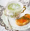 Fördela soppan i koppar. Servera med smörstekta brödskivor toppade med forellrom och dill.
