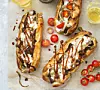Klyv baguetterna men skär inte ända igenom. Bred dem med senap och lägg på en papprad plåt. Fyll bröden med kött och lök och fördela sedan skivad mozzarella ovanpå.