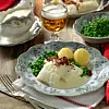 Sås: Smält smöret i en kastrull. Rör i mjöl och späd med mjölk. Koka upp under omrörning och koka i 5 minuter. Tillsätt grädde och smaka av med salt och peppar.