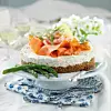 Garnera med lax, skalade räkor, kokt sparris, citron och dill.