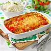 Dela kycklingfiléerna i mindre bitar och bryn i en stekpanna med smör. Lägg över i en form.