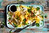 Varva mango, fänkål, koriander, chili och jordnötter på ett fat. Ringla över limesaften och servera med soja