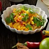 Hacka mangon lite till. Skala och hacka löken fint. Kärna ur chilin och hacka fint. Blanda mango, lök och chili.