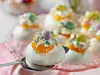 Lägg en klick lemoncurd i varje. Toppa med vispad grädde, chokladägg och strössel.