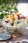 Lägg ett lager maränger på ett uppläggningsfat. Gör kulor av glassen och varva grädd- och yoghurtblandningen, mango, vaniljglass, maränger och hallon på fatet.