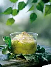 Sila bort lite av saften och lägg rabarbern i en ugnssäker form, i portionsformar eller på ett ugnssäkert fat.
