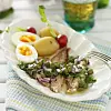 Servera med kokt färskpotatis och ägghalvor.