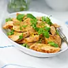 Lägg upp kycklingen och ringla lite av marinaden över. Garnera med örter och citronskal.