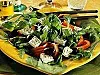 Fördela sallaten på tallrikar. Lägg på urgröpta=kärnfria, strimlade tomater och strö över oliver.