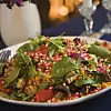 Varva bulgur, spenat, rucolasallad och grillade grönsaker på ett stort fat och strö över granatäppelkärnorna.