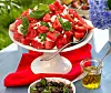 Skala och dela vattenmelonen i kuber och lägg dem på ett uppläggningsfat.