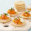 Du behöver Gör så här 1 Skala och hacka rödlöken fint. Skär gräslöken fint. 2 Mikra de frysta blinierna enligt anvisning på förpackningen. 3 Lägg...