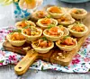 Gör pajdegen. Kavla ut den och ta ut rundlar, ca 10 cm i diameter. Placera i folieformar.