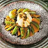 Skala kiwin och skär den i båtar. Skala mangon och skär loss fruktköttet intill den platta kärnan. Skär fruktköttet i fina bitar. Sikta florsocker över kakan och lägg frukten i ett vackert mönster ovanpå kakan. Toppa med vaniljglass. Halvera passionsfrukterna och krama ur det lösa fruktköttet över glass och frukt.