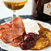 Stek kotlettbacon och servera till plättarna tillsammans med keso och lingonsylt.