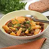 Skala potatisen, skär den i klyftor och blanda ner dem i grytan. Häll i resten av vattnet och koka grytan tills potatisen känns mjuk. Späd med mer vatten om det behövs och smaka av med mer kryddor.