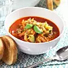 Tillsätt tomatpuré och buljong och koka upp. Krydda med smulad basilika, salt och peppar och sjud soppan ca 10 minuter. Smaka av. Garnera med basilika och servera med rostad skivad baguette.