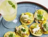 Lägg upp avokadosalsan i en skål och lägg en matsked på varje nachochips. Fortsätt med mangosalsa och krabba. Toppa med hackad koriander. Servera genast!