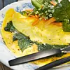 När ytan fortfarande är krämig men kanterna är fasta är det dags att vika ihop omeletten och lägga upp på en tallrik eller dela på mitten och lägga upp på två tallrikar.