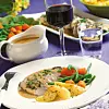 Sås: Sila ner skyn i en kastrull och späd med köttbuljong till totalt 3 dl. Vispa ut mjölet i grädden och vispa ner i buljongen. Koka upp under omrörning och låt såsen sjuda i 3 minuter. Smaka av med salt och peppar. Servera med klyftpotatis, sås och kokta morötter och haricots verts.