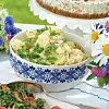 Dressing: Blanda oregano, persilja, senap, vinäger och crème fraiche. Smaka av med salt och peppar. Blanda ner potatis och äpple.