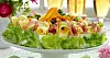 Garnering: Blanda crème fraiche och kesella och bred runt om och ovanpå tårtan. Garnera enligt bilden med skinka- och ostrullar, apelsinskivor, vindruvor, physalis, sallad och persilja eller efter egen fantasi.