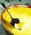 Skär ostmassan korsvis med kniv. Rör sedan långsamt med en trägaffel. Låt massan stå. Ostmassan sjunker till botten.