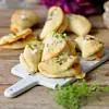 Lägg pirogerna på en plåt med bakplåtspapper. Pensla pirogerna med olja och strö över flingsalt och timjan. Grädda mitt i ugnen, ca 10 minuter. Serveras nygräddade.
