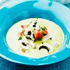 Fördela grönsakerna i sopptallrikar och häll het soppa över.