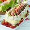 Garnering: Bred crème fraiche runt kanterna och ovanpå tårtan. Spritsa resten av fyllning 1 runt kanten. Tryck fast ostskivor på kanten runt om tårtan. Lägg skinka, delade vindruvor och jordgubbar och hackade valnötter ovanpå.