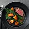 Salta sötpotatisen och rosta i ugnen samtidigt som köttet tills den är mjuk, cirka 15 minuter. Värm såsen och vispa ner smöret strax innan servering. Hetta upp en stekpanna och stek svartkålen hastigt i olja. Salta. Servera på uppläggningsfat eller på tallrikar.