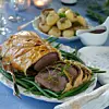 Var noga med innertemperaturen i köttet eftersom temperaturen fortsätter att stiga efter att man tagit ut köttet ur ugnen. Smördegen gör att det håller värmen väldigt bra.