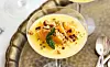 Pannacotta är perfekt att förbereda och bara toppa vid servering. Vit choklad som rostas i ugnen blir till ett knäckigt strössel att toppa desserten med.