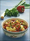 Skala potatisen och skär den i lika stora bitar. Ansa och strimla purjolöken. Kärna ur och strimla paprikan.